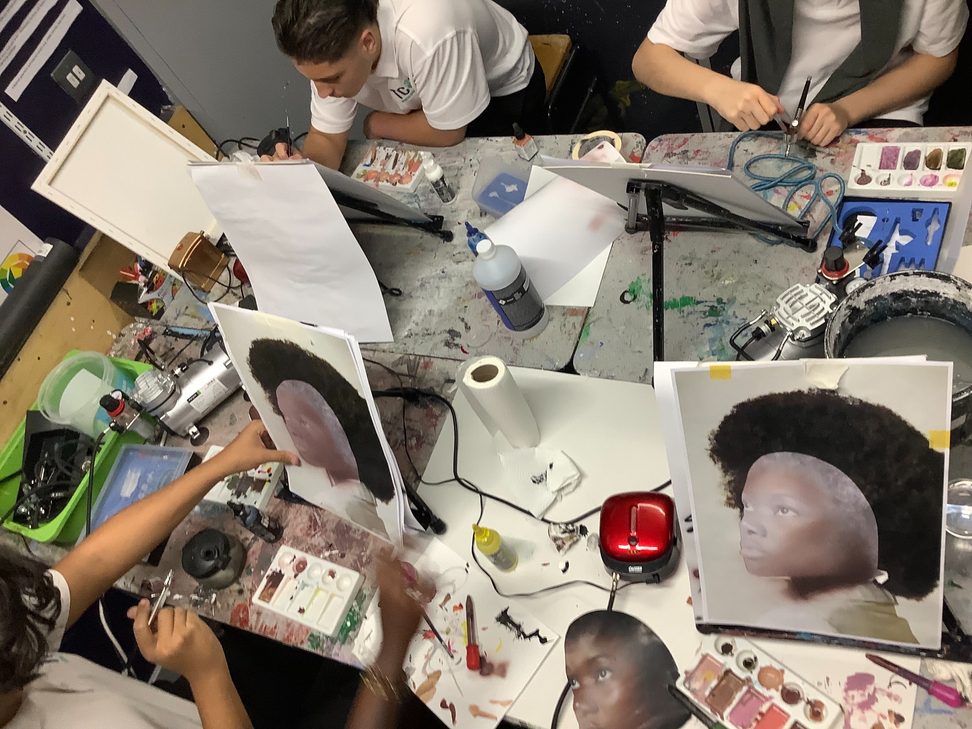Inspired by the theme of Black History Month, a group of our students at TCES North West London School took part in a special airbrush workshop led by visiting artist Dan. Using photographs as a base, students learned to apply airbrush techniques to explore a wide range of realistic skin tones and subtle shading.